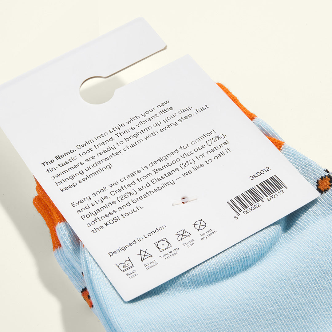 The Nemo. Swim into style with your new fin-tastic foot friend. These vibrant little swimmers are ready to brighten up your day, bringing underwater charm with every step. Just keep swimming!